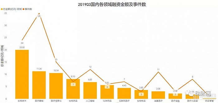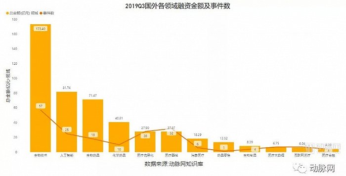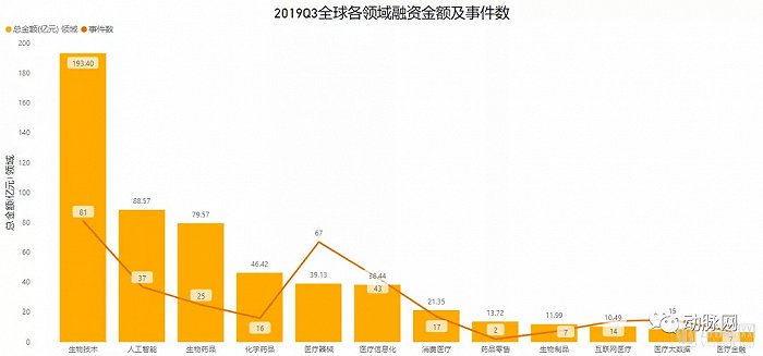 全球范围内,生物技术依然是最热门的投资领域,81个融资项目、融资总额达193.4亿人民币,占2019Q3总融资额的31%。医药领域(生物药品+化学药品+生物制品)和人工智能分列第二和第三。