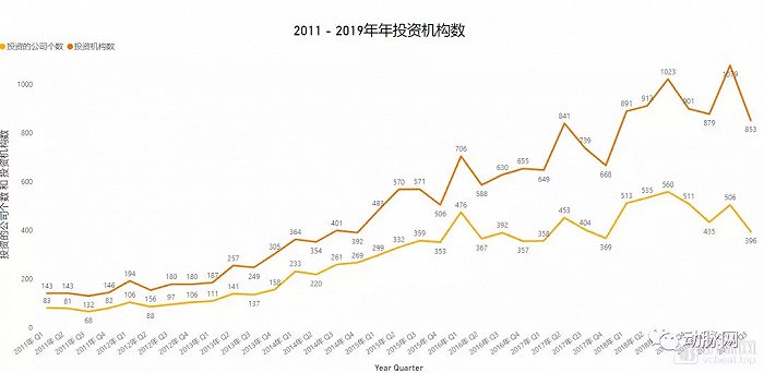 2019年第三季度全球共有853家投资机构参与投资,这一数字也是近7个季度以来的最低水平。机构数量与融资项目数量两曲线呈正相关趋势,随着本季度融资项目的下滑,参与投资的机构也有所下滑。