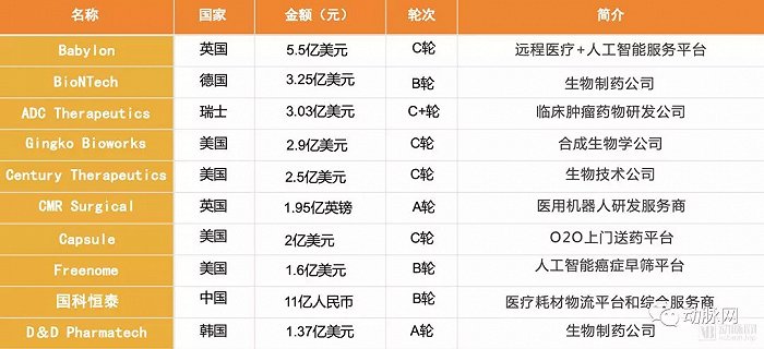 中国的国科恒泰凭借在9月6日完成的超11亿人民币C轮融资入围2019Q3融资TOP10,这也是2019年来国内医疗器械流通领域内融资规模较大的项目。致力于成为“中国领先的医疗器械数字化供应链综合服务商”的国科恒泰,为医疗器械生产厂家、流通企业、终端医院、政府监管层等提供全方位综合的“数字化供应链生态平台服务”。
