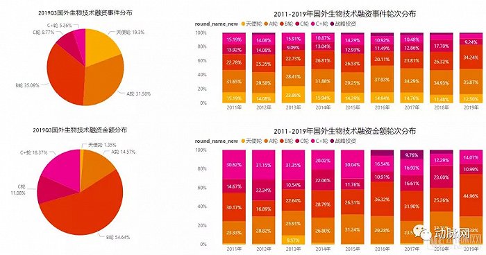 2019年也成为国外生物技术领域B轮融资金额占比最高的一年,占比高达54.64%,A轮融资金额占比下降10%。一方面得益于欧洲最大私营生物制药公司BioNtech超20亿人民币融资,以及癌症早筛知名公司Freenome、细胞疗法新锐Achilles Therapeutics等公司的巨额融资,另一方面也反映出国外生物技术领域的项目成熟度后移的趋势。