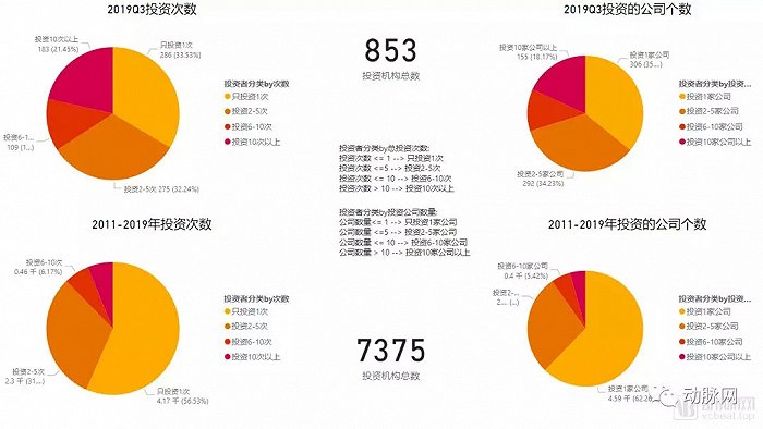 从机构的投资次数和投资公司个数来看,2019年Q3投资机构的变化更加明显。只投资一次的投资机构占比减少了22%,只投资一家公司的投资机构占比减少了26%。与之相反的是投资6次以上和投资6家公司以上的投资机构占比大大提升。