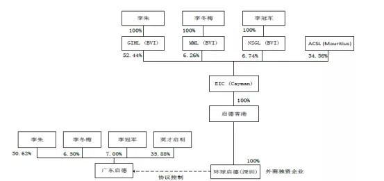 早在2013年,为了准备上市,启德教育便搭建了VIE架构。启德教育的经营实体为广州启德,李朱、李冬梅夫妇合计持有广东启德57.12%的股份,实际控制广东启德。同时李朱、李冬梅等人在境外设立EIC(Cayman),并下设启德香港、环球启德协议控制广州启德。