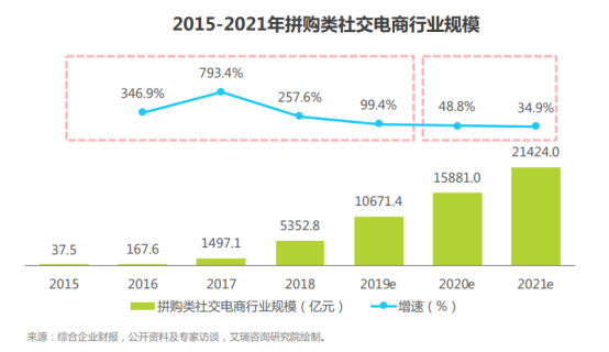 数据显示,拼购电商规模在2015年是37.5亿元,到2018年已经高达5352.8亿元,3年足足增长了140多倍。