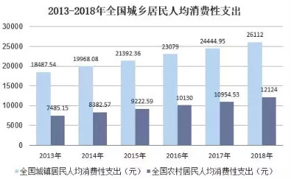 比如,2018年,全国居民人均可支配收入是28228元,相比2017年增长了2254.21元。钱包越来越鼓,花得自然也越来越大方。2018年全国居民人均消费性支出达19853元,相比2017年增长了1530.85元。