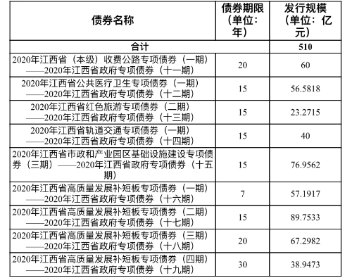 (二)品种和数量。2020年江西省政府专项债券(十一至十九期)为记账式固定利率附息债,计划发行面值总额为510亿元,具体情况如下: