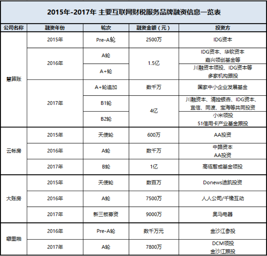 2017 年,主要互联网财税服务品牌融资再现新一轮高潮。