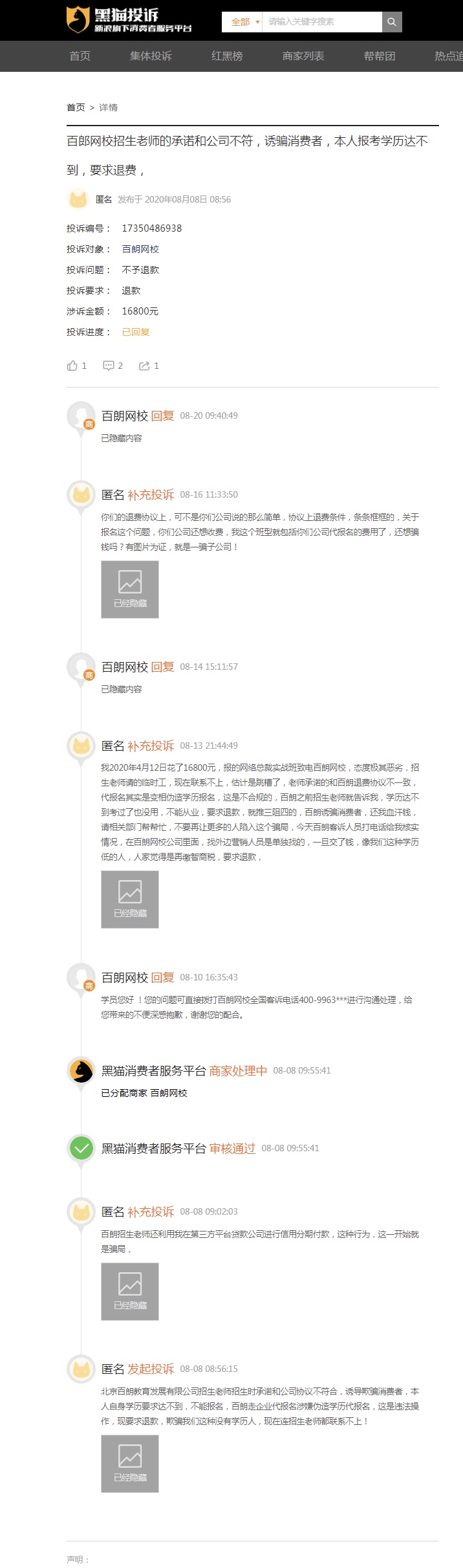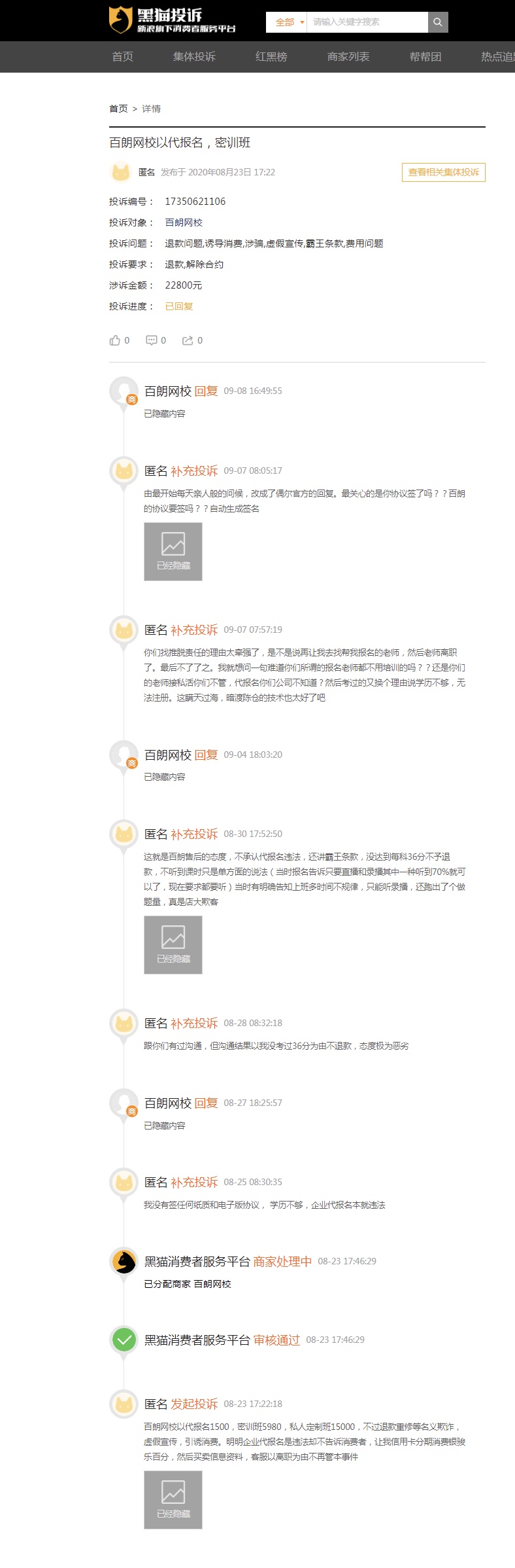 环球网记者在黑猫投诉平台上发现有多名消费者投诉百朗网校存在企业违规代报名的情况。有消费者发布投诉称,北京百朗教育发展有限公司(百朗网校)的招生老师在招生时的承诺与公司协议不符合,诱导欺骗消费者。消费者称,其自身学历要求达不到报名要求,然而百朗网校声称可以走企业代报名的方式,消费者认为此种行为涉嫌伪造学历代报名,为违法操作。现在无法联系上招生老师,消费者要求机构退款。