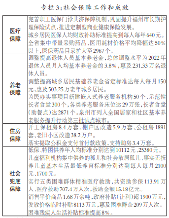 民生保障进一步增强。省委省政府29项为民办实事项目全面完成。民生支出4527.15亿元、增长3.7%,占一般公共预算支出的77.1%。深入实施全民参保计划,企业职工基本养老保险全国统筹、失业保险省级统筹稳步开展。继续提高城乡居民医保财政补助标准,健全大病保险和医疗救助制度。建立基本养老服务清单动态调整机制。完成退役军人接收安置任务,开展“我为老兵办实事”活动。率先建立低收入人口动态监测和救助帮扶机制,基本建成分层分类的社会救助体系。加大普惠托位供给,增加1.28万个普惠托位,厦门市获评第一批国家婴幼儿照护服务示范城市。厦门、泉州列入第二批国家儿童友好城市。龙岩市全国青年发展型城市建设试点中期评估获优秀。提高孤儿、事实无人抚养儿童基本生活最低养育标准,建立自然增长机制,制定实施孤独症儿童关爱服务措施,乡镇(街道)未成年人保护工作站覆盖率达83.8%。以“整镇推进、一户一案、扩量提质”等方式推进残疾人家庭无障碍改造1万户,经验在全国推广。持续做好保供稳价,居民消费价格与上年持平,压实“菜篮子”市长责任制。