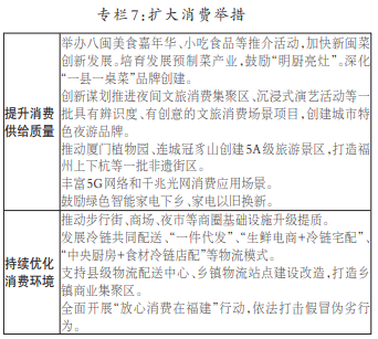 巩固消费复苏态势。推动消费从疫后恢复转向持续扩大,激发有潜能的消费,培育壮大新型消费,稳定和扩大传统消费。持续深化“全闽乐购”,加快发展夜间经济、直播经济、首店经济等新兴消费,促进福建老字号创新发展。鼓励新能源汽车、二手汽车消费,扩大停车位供给,优化提升充电基础设施建设。支持刚性和改善性住房需求,促进家庭装修、智能绿色家电消费。扩大服务消费,促进文娱体育会展消费和健康服务消费。提质做优文旅消费,围绕打造世界知名旅游目的地“11537”发展思路和布局,持续打响“海丝起点 清新福建”品牌,做好保护、传承、传播、发展“四篇文章”,办好海上丝绸之路国际艺术节、旅游节以及世界妈祖文化论坛等重大品牌活动。深入实施县域商业建设行动,健全县乡村物流配送体系,推动绿色产品进城。加快建设福厦“一小时生活圈”,打造“一刻钟”便民生活圈。