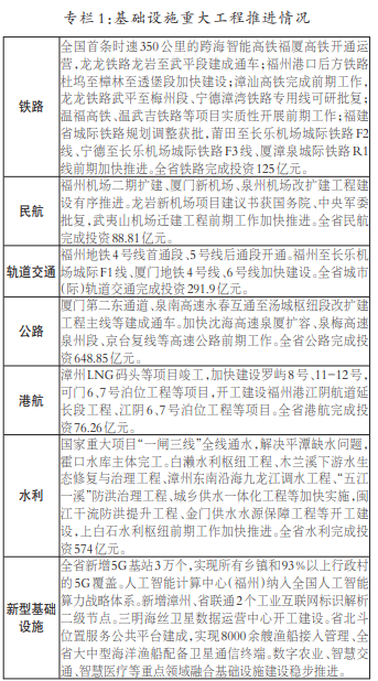 投资关键作用有效发挥。固定资产投资增长2.5%,其中,制造业投资增长11.6%,基础设施投资增长5.7%。发挥政府投资引导带动作用,探索编制省级政府投资计划,新增地方政府专项债务限额1618亿元、分解下达中央预算内投资99.9亿元、争取增发国债资金240.5亿元、安排省级预算内投资31.5亿元支持重大项目建设。1580个省重点项目完成投资7387亿元,完成年度计划的114%。聚焦重点领域,谋划储备项目2831个、总投资2.3万亿元。实现高质量发展融资1094.5亿元,推动基础设施REITs试点工作,14个项目纳入项目库跟踪管理。2023年福建省与央企深化合作推进会、第二十三届中国国际投资贸易洽谈会、第十三届民营企业产业项目洽谈会等重大招商活动成功举办,与中核、中能建等7家央企签订战略合作协议,纳入跟踪管理的全省重大招商项目共579个、开工率94.3%。