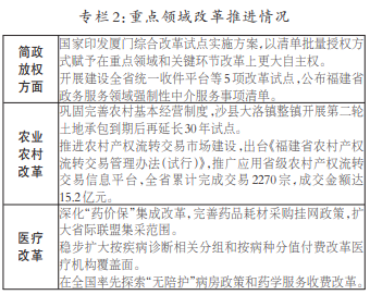 重点领域改革深入推进。出台纵深推进全面深化改革的实施方案。新一轮国企改革深化提升加快推进,启动对标世界一流企业价值创造行动,12家企业入选国家“双百企业”,8家企业参与国家“科改行动”。农业农村改革稳步实施,“三医”协同改革纵深推进,商事制度改革进一步深化,集体林权制度改革不断取得新成效,价格改革稳妥推进。
