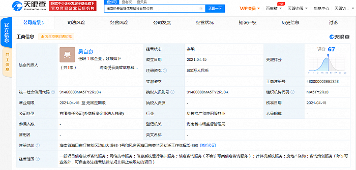 据天眼查APP显示,4月15日,海南悦云美智信息科技有限公司成立,注册资本500万人民币,法定代表人为吴自良,经营范围包括网络技术服务;信息系统运行维护服务;房地产咨询等。股东信息显示,该公司由美的置业集团有限公司全资持股。
