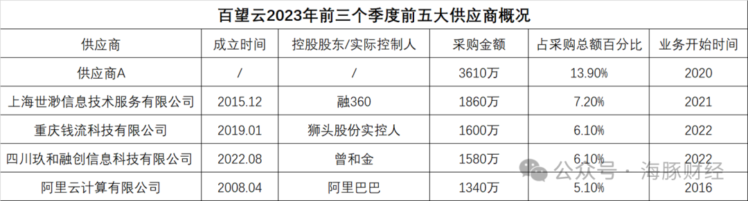 招股书披露了百望云前五大供应商,2023年前三个季度,除了最大供应商没有披露名称外,其余几家分别为融360旗下的上海世渺信息技术服务有限公司、狮头股份实际控制人掌控的重庆钱流科技、四川玖和融创信息以及阿里云。