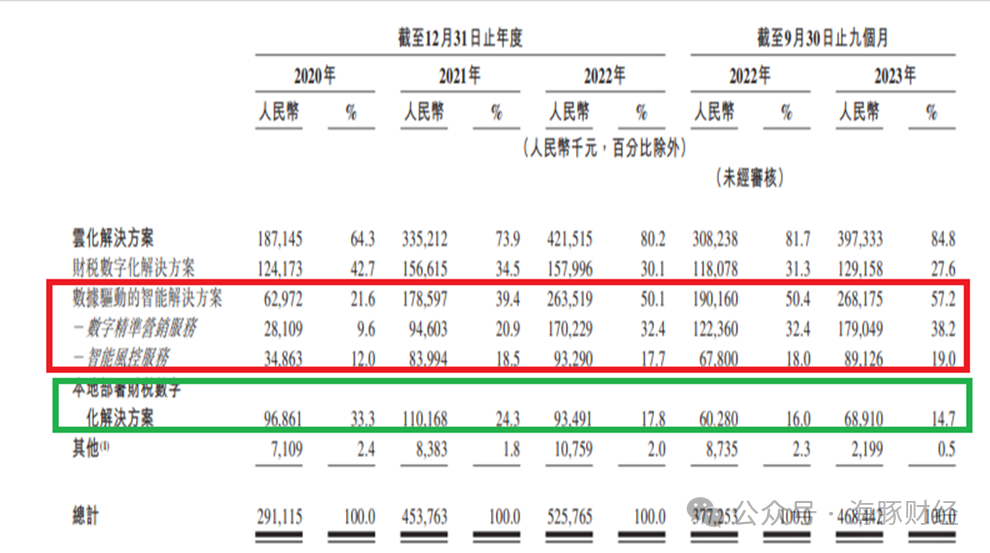 2020年、2021年、2022年及2023年前三个季度,百望云来自财税数字化解决方案的收入分别为1.24亿元、1.57亿元、1.58亿元、1.29亿元,分别占同期总收入的42.7%、34.5%、30.1%、27.6%,营收增长缓慢,在总收入中占比逐步下滑;同期来自数据驱动的智能解决方案的收入分别为6300万元、1.79亿元、2.64亿元、2.68亿元,分别占同期总收益的21.6%、39.4%、50.1%、57.2%,占比逐年提升。