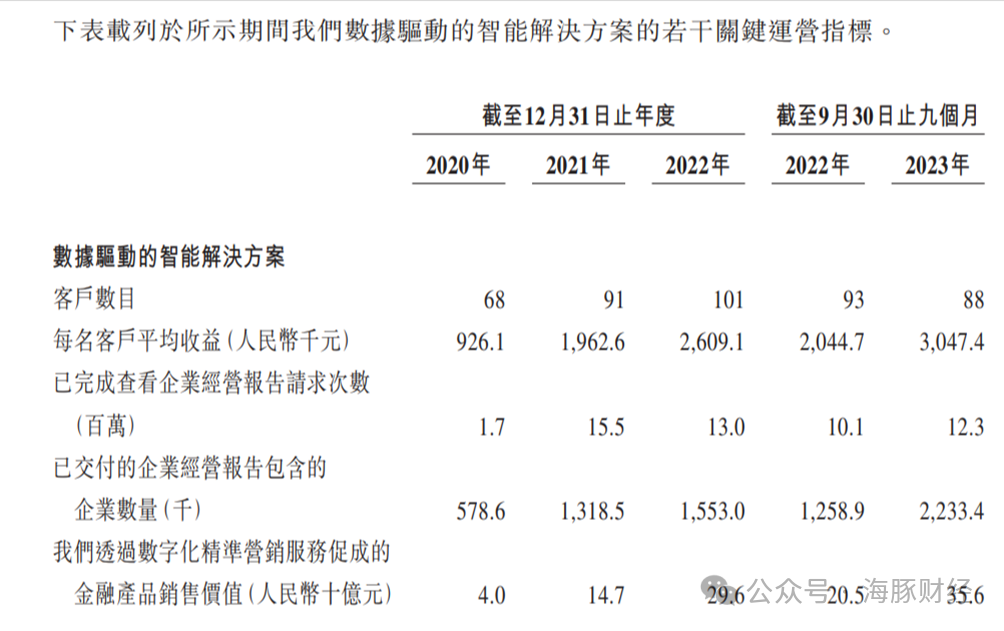 招股书显示,百望云的服务对象包括银行、持牌消费金融以及小贷公司。截至2020年、2021年、2022年及2023年9月末,百望云利用数据驱动的智能解决方案服务的金融客户分别为68名、91名、101名及88名。截至2023年9月,百望云每名客户的平均收益为305万元;已交付的企业经营报告包含的企业数量约223万家,数字化精准营销服务促成的贷款规模约356亿元。