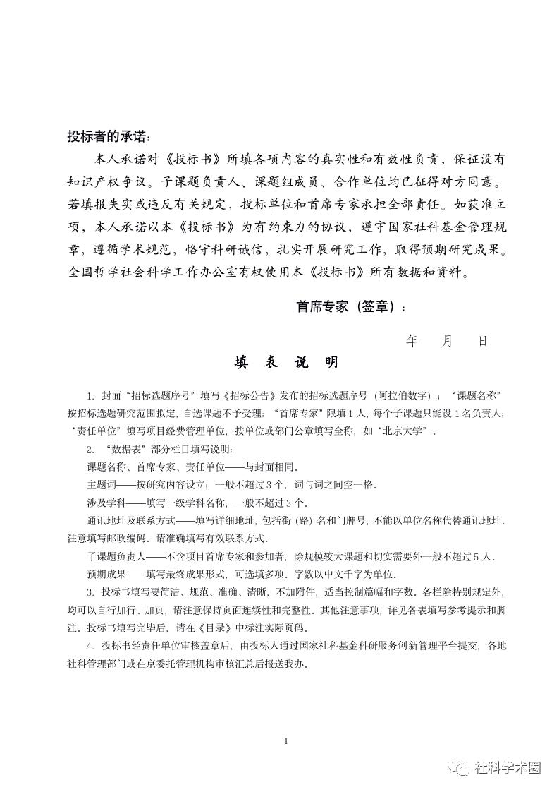 1.投标者须按《招标公告》发布的选题研究方向(附后)投标,自选课题不予受理。本次投标须按照新修订的《投标书》(2021年7月制)规定的内容和要求填写申报材料,填报以前版本无效,《投标书》文本要简洁、规范、清晰,篇幅原则上不超过10万字,不加附件。