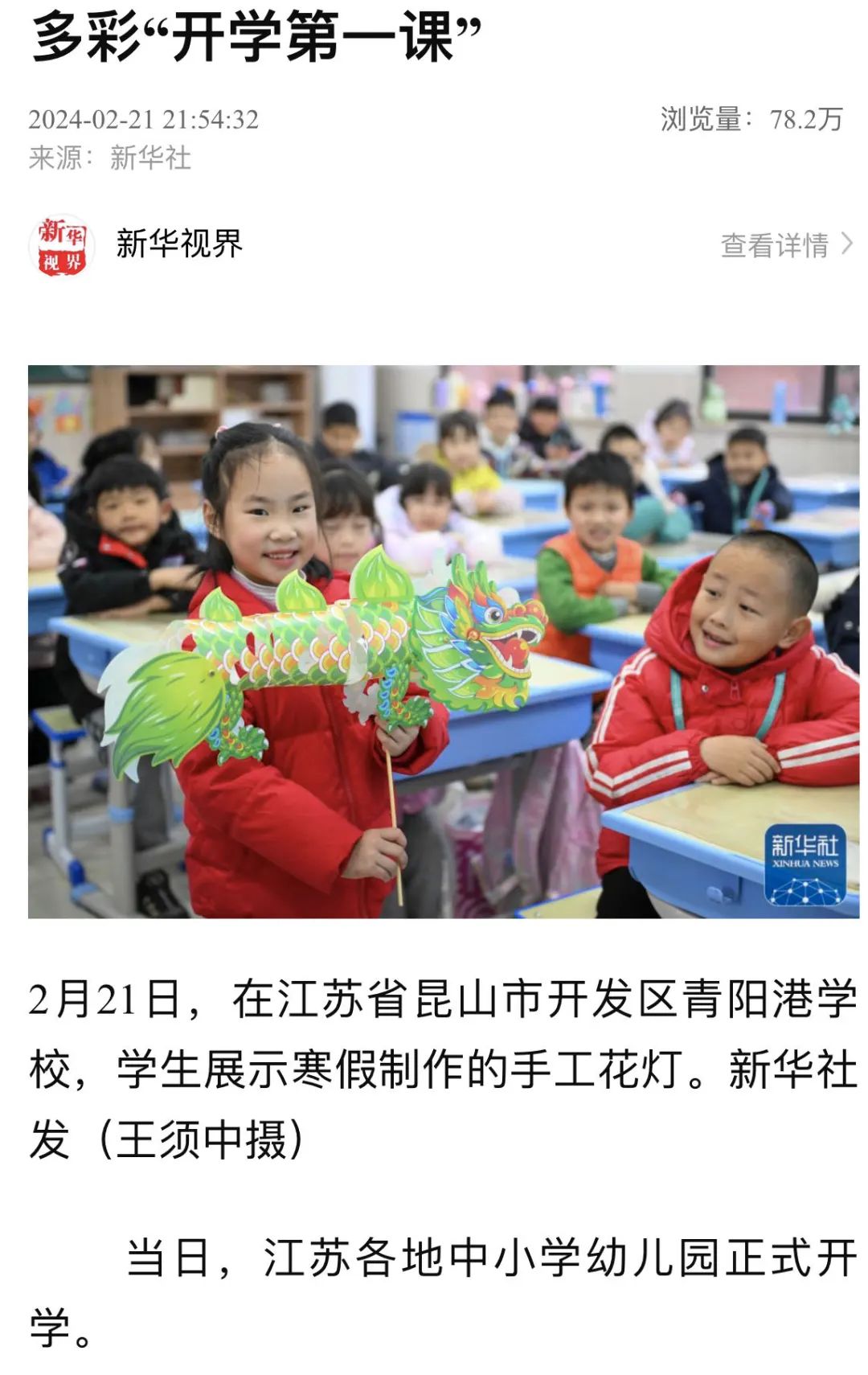 新华社客户端刊发《多彩“开学第一课”》。报道了江苏各地中小学幼儿园正式开学,学校联合多个部门开展防诈骗、法治宣传、消防实践等“开学第一课”内容。