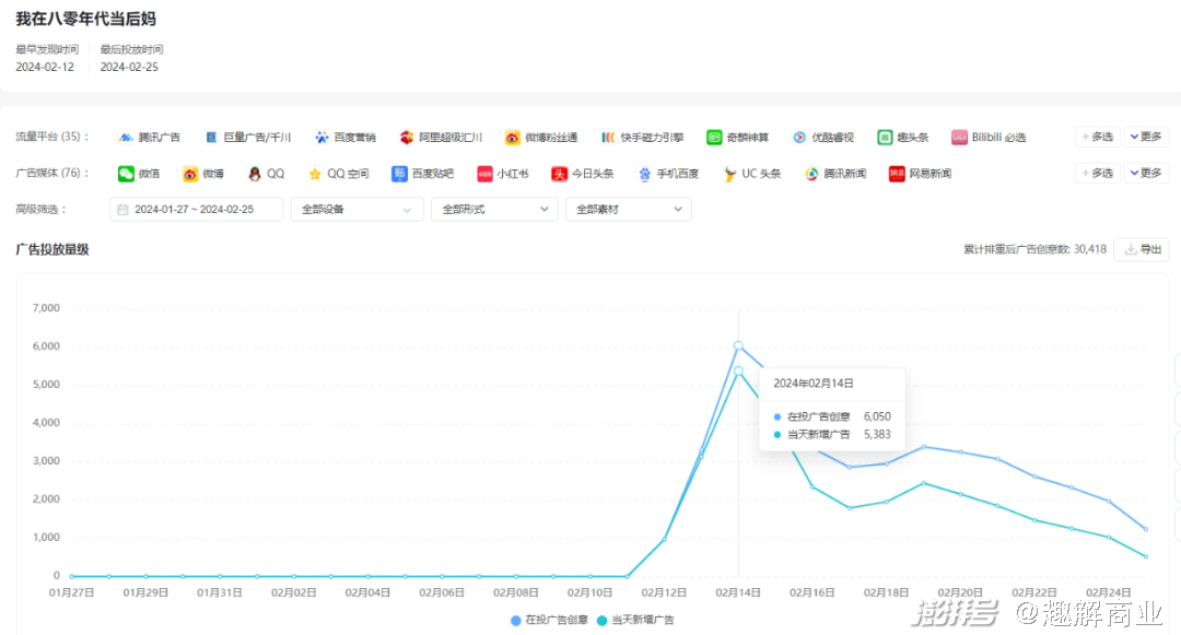 根据有米云旗下AppGrowing中国版的数据显示,《八零后妈》上线一周的投放广告数多达1.7万余条,投放平台包括腾讯、抖音、微博、快手等多个头部社交媒体平台。