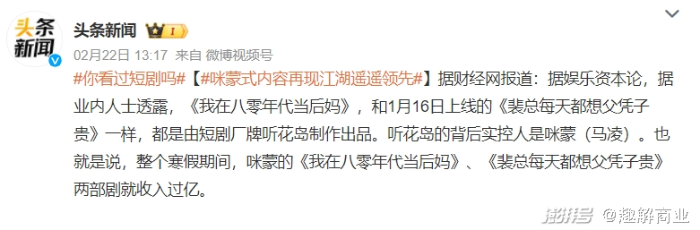 唯一的例外还是咪蒙旗下团队和其出品的《八零后妈》、《父凭子贵》,“短剧抢走8亿元春节档票房”就是以这两部短剧做营销由头迅速成了热点新闻。