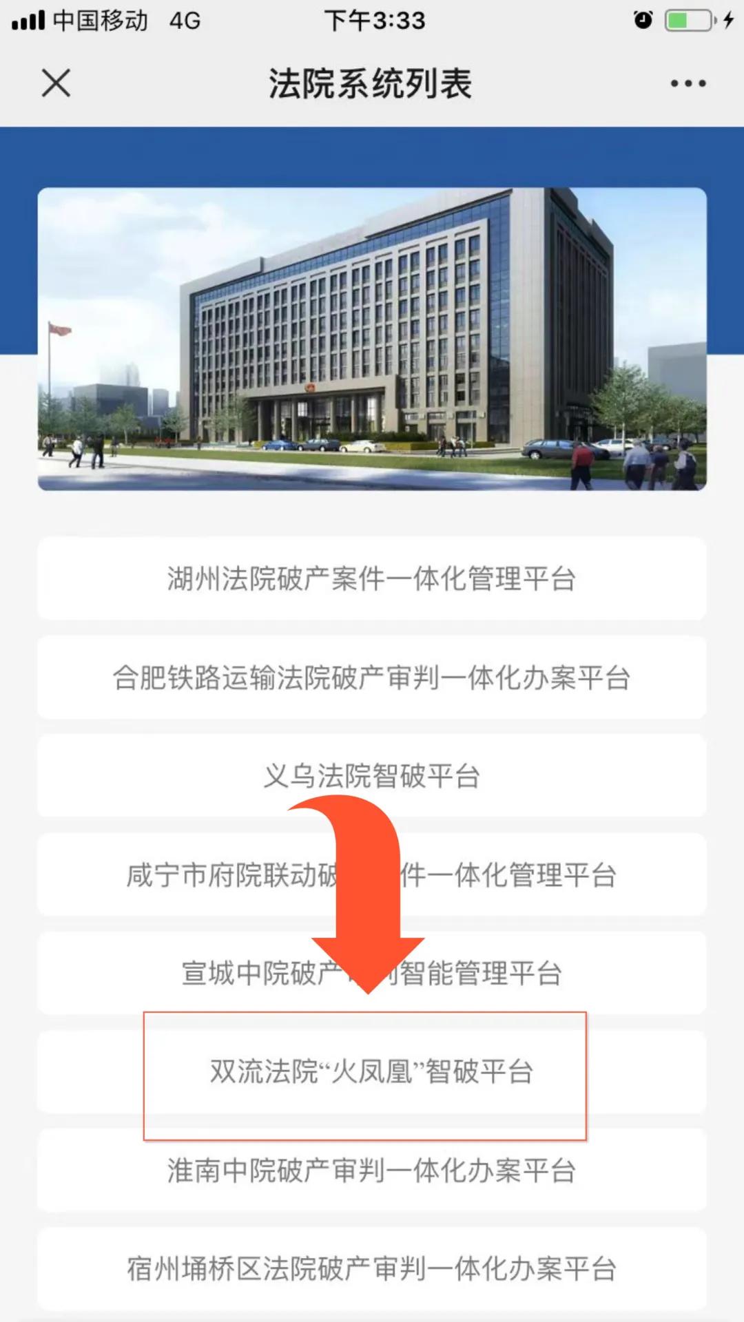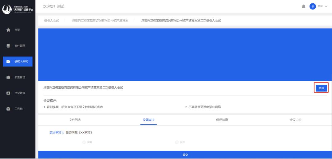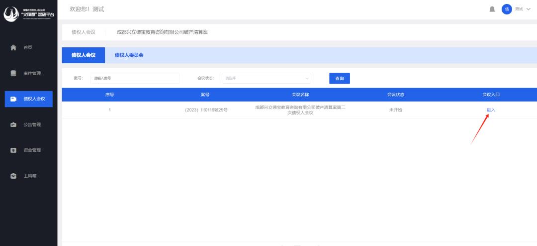 3 ► 登录后,选择“债权人会议”板块,进入后会出现“会议列表”,选择需要参加的债权人会议,点击进入即可。如下图所示: