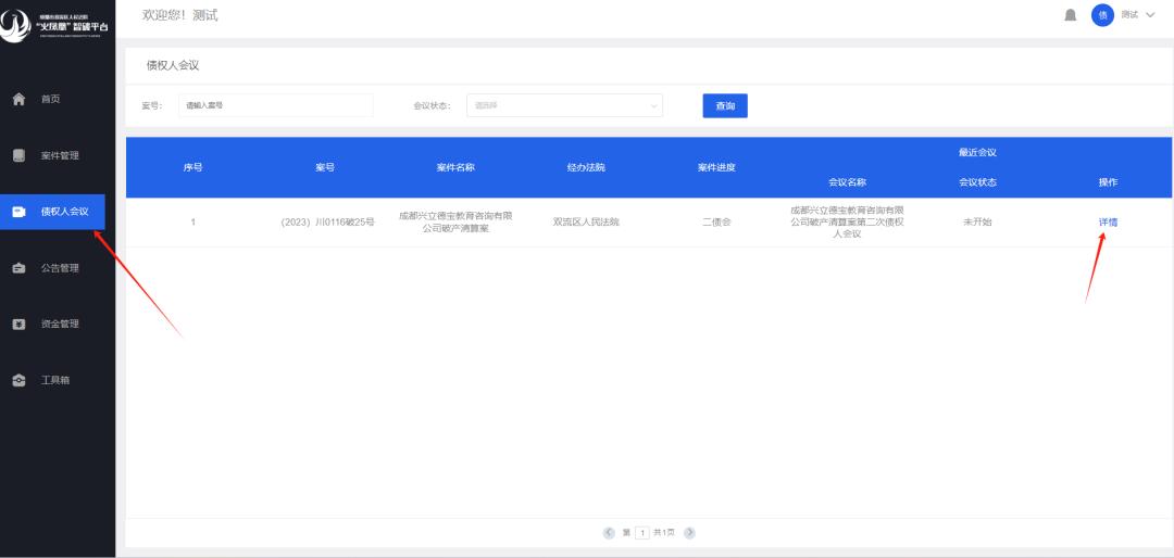 2 ► 登录签到后,选择“债权人会议”板块,会出现“会议列表”,选择需要参加的债权人会议,点击右边“操作”下的“详情”按钮进入。如下图所示:
