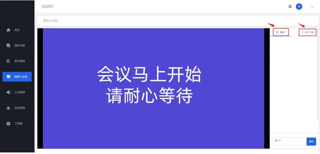 点击“聊天消息”按钮:债权人输入内容后,点击“发送”按钮即可。若显示“禁止中”,说明当前暂未开放(视会议情况开放)。