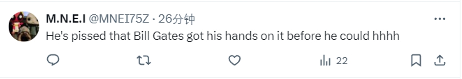 “他只是因为比尔·盖茨比他先一步拿到手而气到了,哈哈哈,”另一位网友调侃地评论道。