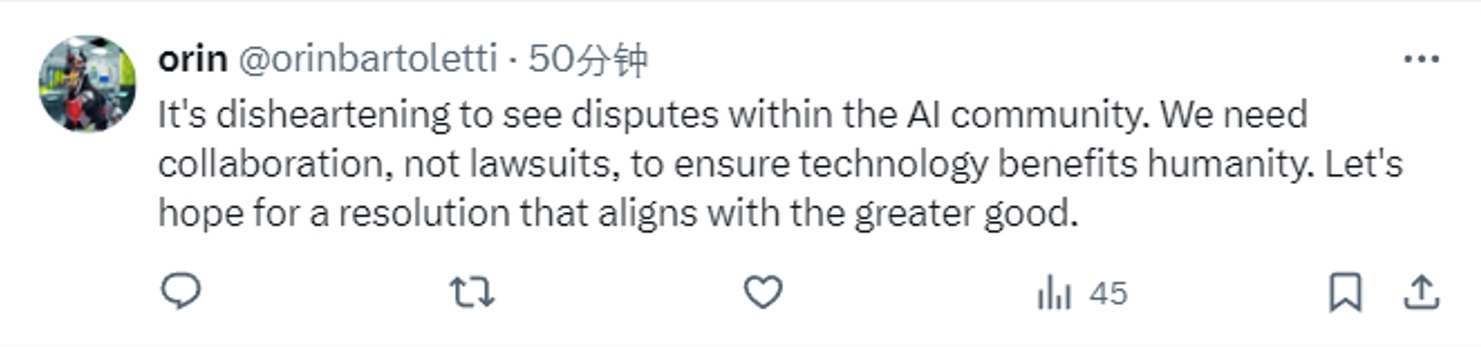 “看到AI社区里的争议令人会心。我们需要的是合作,而不是诉讼,才能确保AI有益于人类。希望能有一个致力于社会最崇高利益的解决方案。”