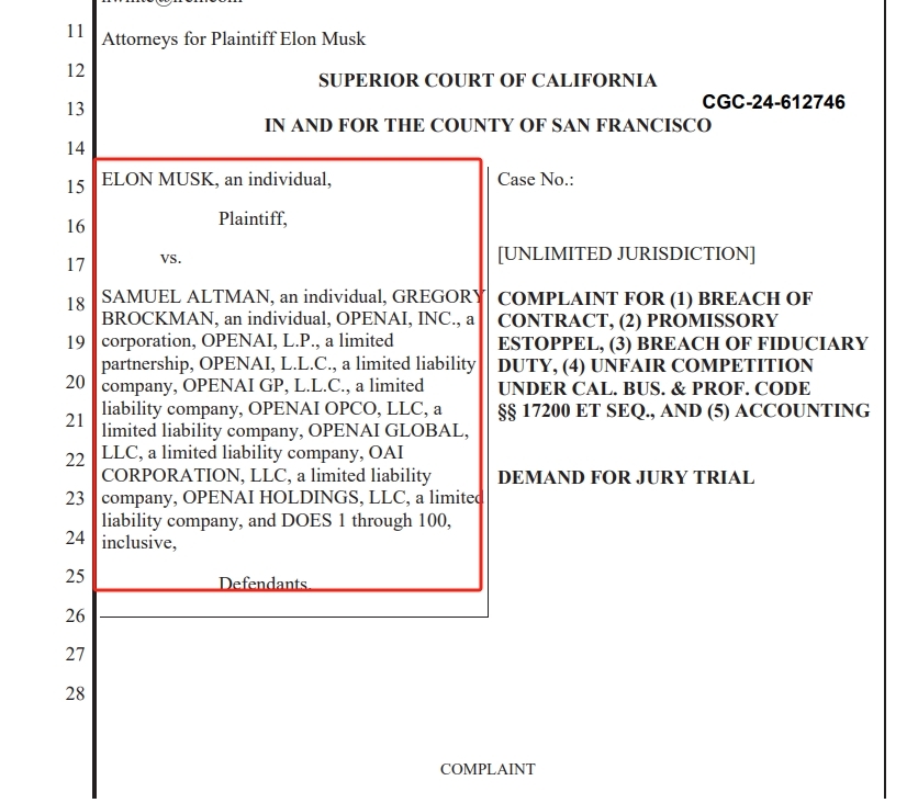 马斯克提出了违约、违反受托责任和不公平商业行为等指控,要求OpenAI恢复到开源状态。马斯克还要求法院禁止OpenAI、布罗克曼、阿尔特曼,以及Microsoft从公司的AGI技术中获利,其中前三者被列为共同被告。
