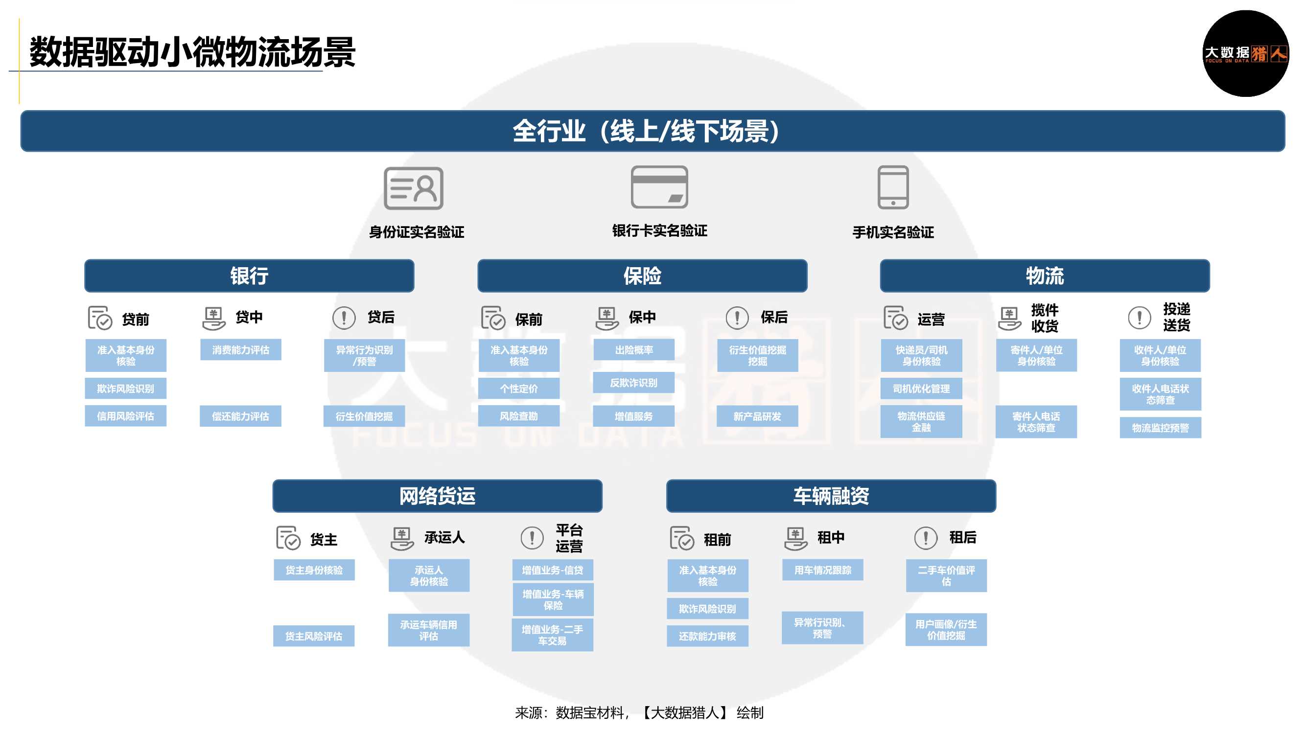 银行小微物流普惠金融场景,在贷前的欺诈行为、信用情况及身份真实性的判断;贷中的通过历史消费能力判断借款能力,偿还贷款的能力的评估;贷后的异常行为识别及预警,如消费能力的突然下降、消费偏好的改变等。当然针对还款正常的群体,银行会通过数据挖掘为这些群体提供更多的匹配的衍生服务,获得更多的收益。