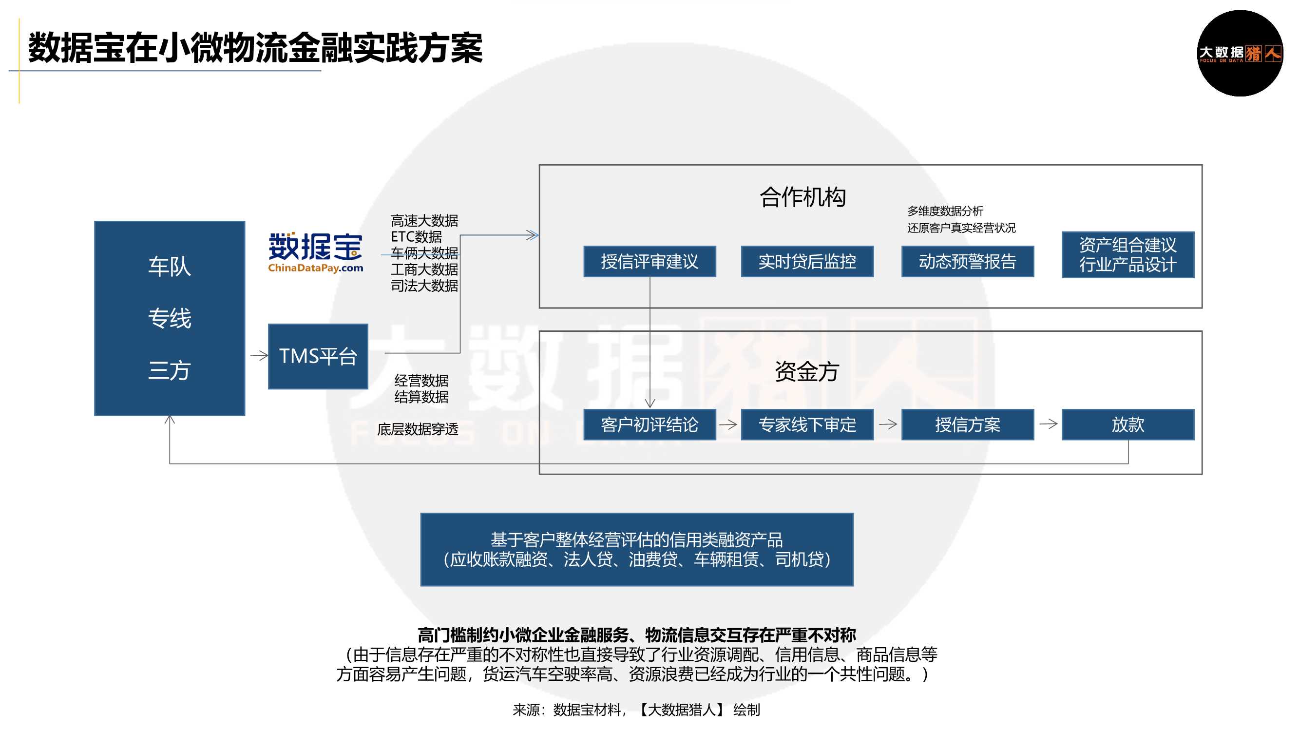 如果说头部物流企业集团是通过集团内对各合作伙伴的强合作关系及无比清晰的数据链为授信基础,辅助性结合外部数据的物流金融模式,这类模式无太大的普及能力,那通过政府的数据普惠结合三方物流系统服务平台相结合的小微普惠金融模式应该值得相关机构研究参考。