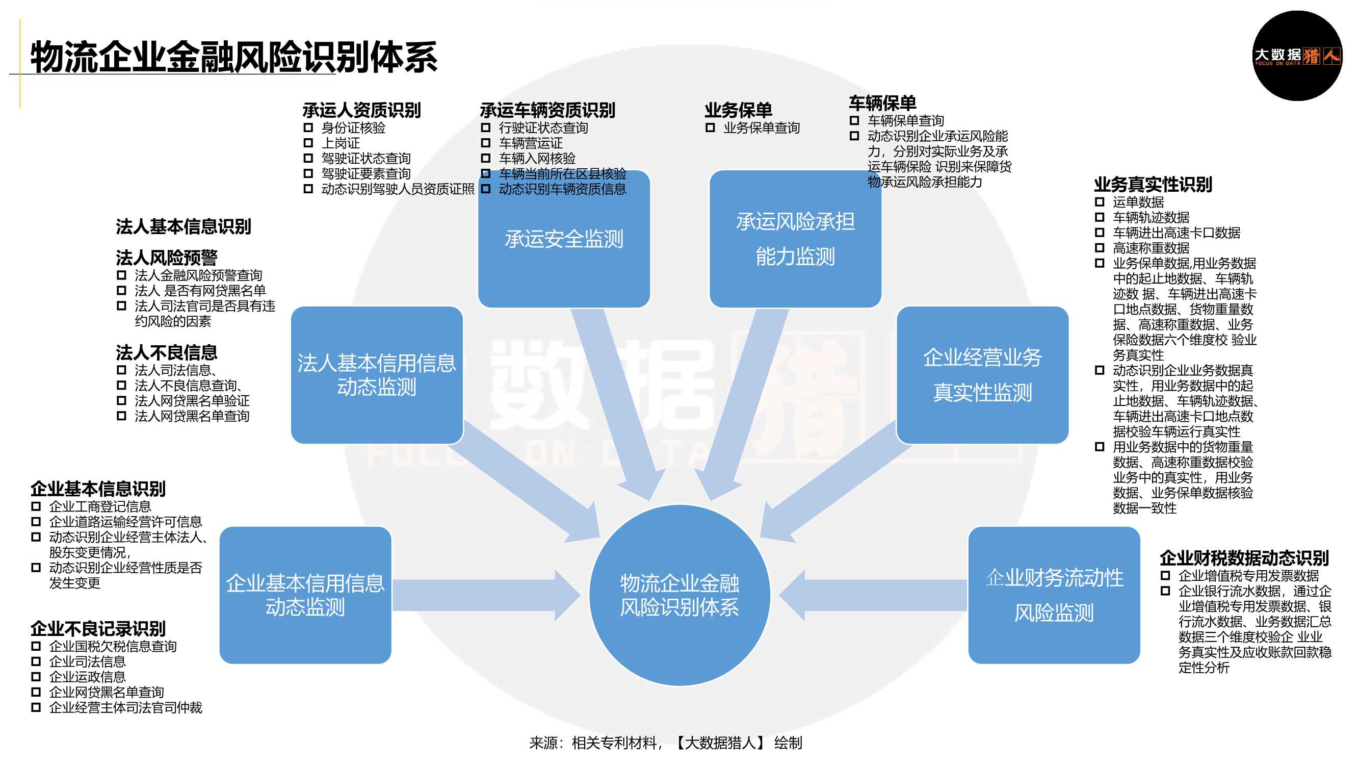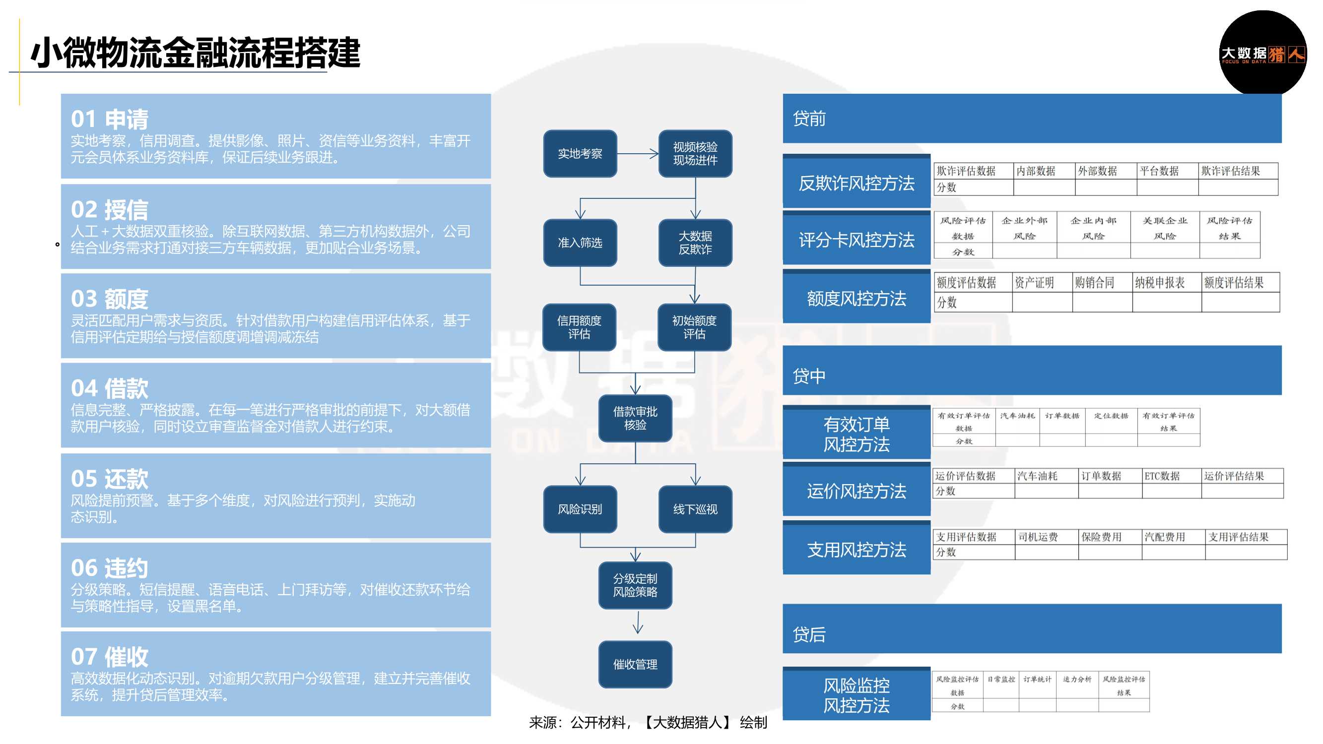 4. 小微物流金融风控体系小微物流金融风控体系与常规物流金融风控体系有着明显差别,主要是小微物流金融主要的金融产品额度不高,主要通过线上全自动审核,所以能够使用的数据来源决定了小微物流金融的可行性。