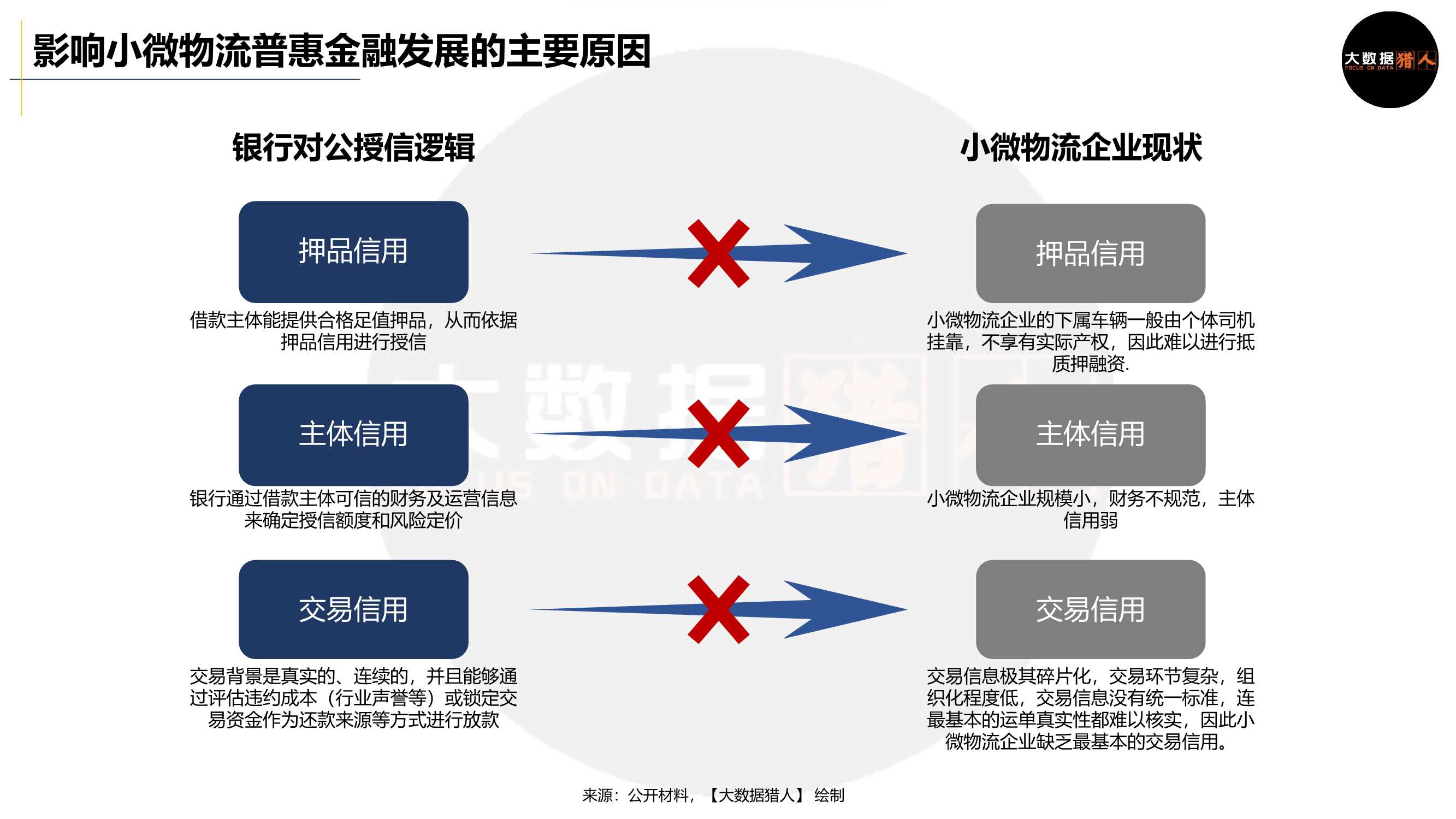 小微物流普惠金融基本上都是无抵押的信用类金融产品,额度不会高,主要能获取现金流判断借还款能力即可,其他的信用数据相对还是好获取。唯一无法判断的是有足够的还款能力及信用够好,但也不能保障其会一定按时还款。