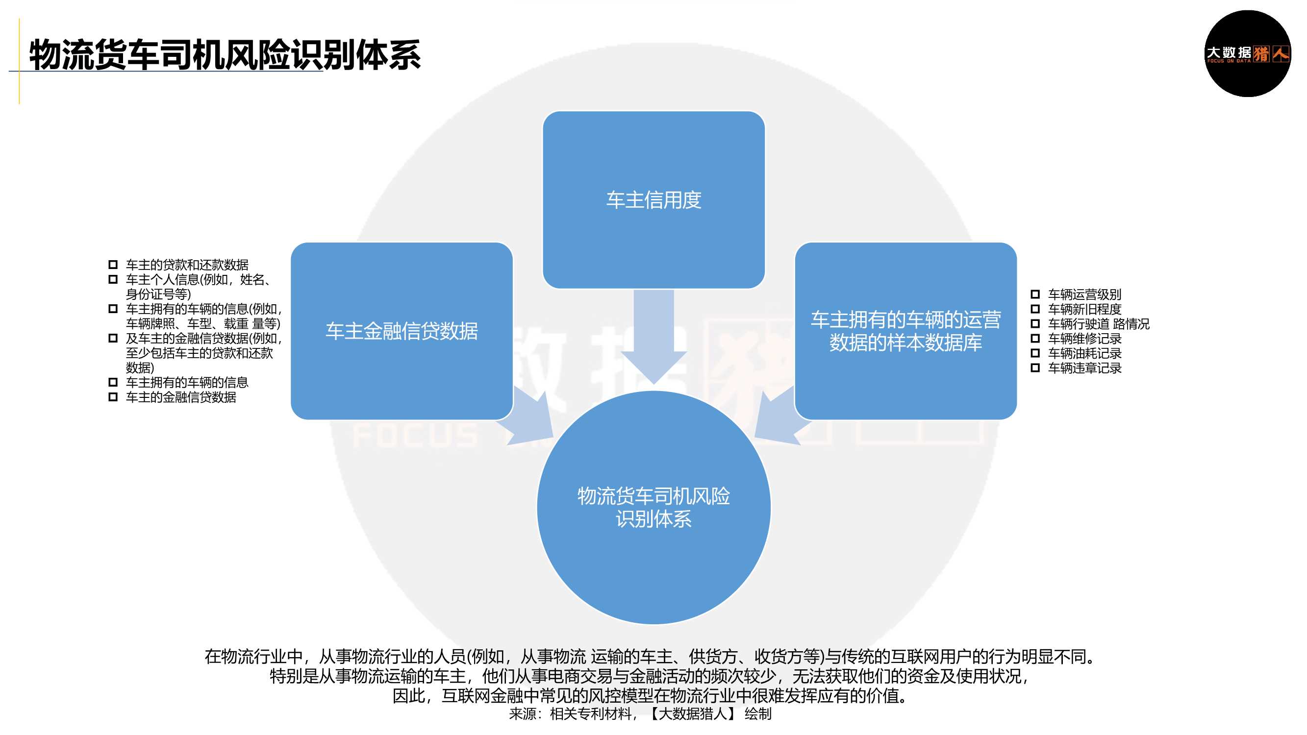针对物流货车司机群体,基本是头部物流企业、网络货运平台及区域物流信息中心等掌握大部分物流司机群体运营数据的机构与金融机构联合发起。使用互联网金融的金融产品体系及风控体系。需要打造车主金融信贷数据体系及车辆运营数据库。