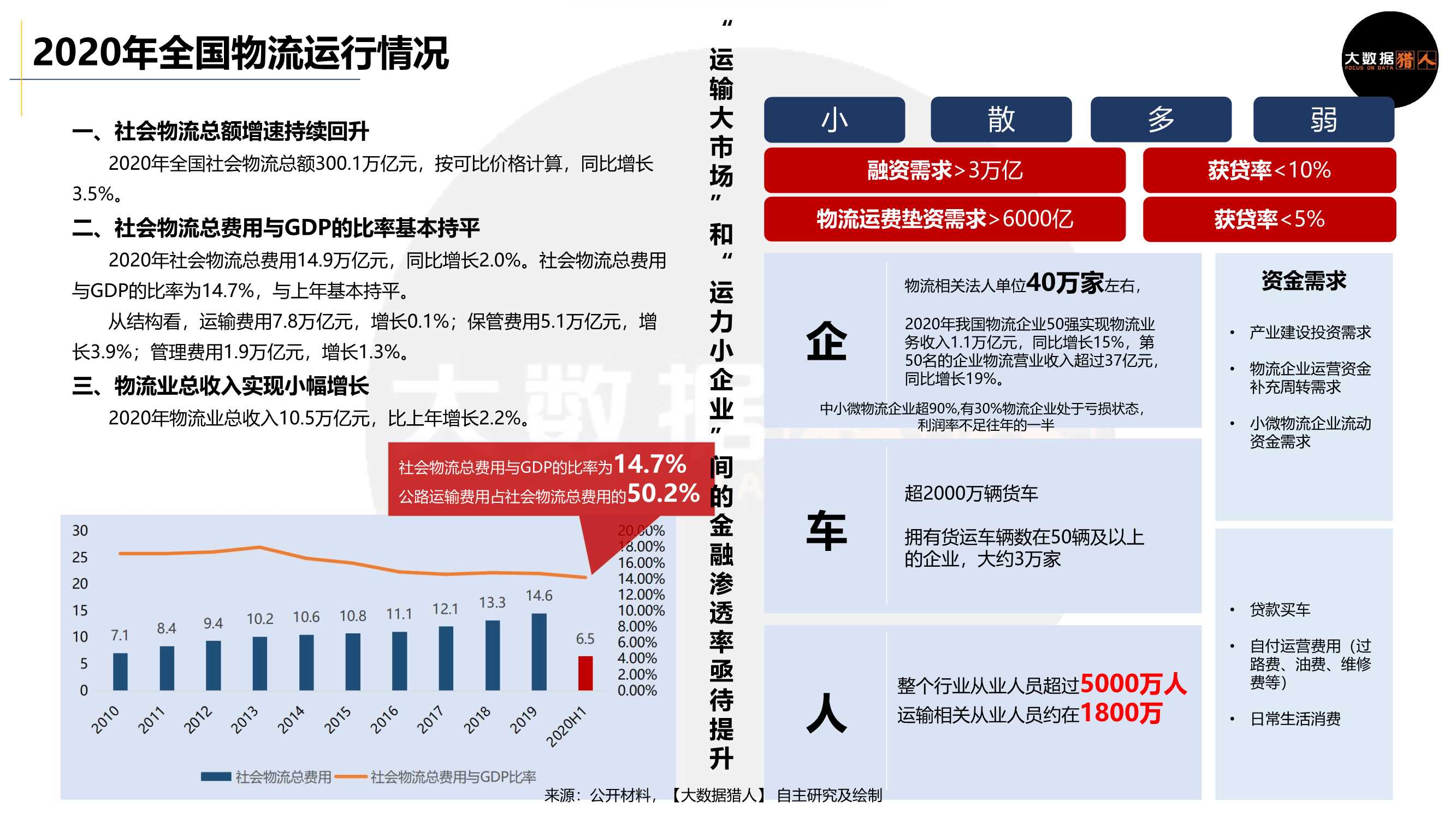 所以物流费用金融这个市场的确是事实上的“运输大市场”,而整个行业属于“运力小企业”,从“企”“车”“人”三方面体现。