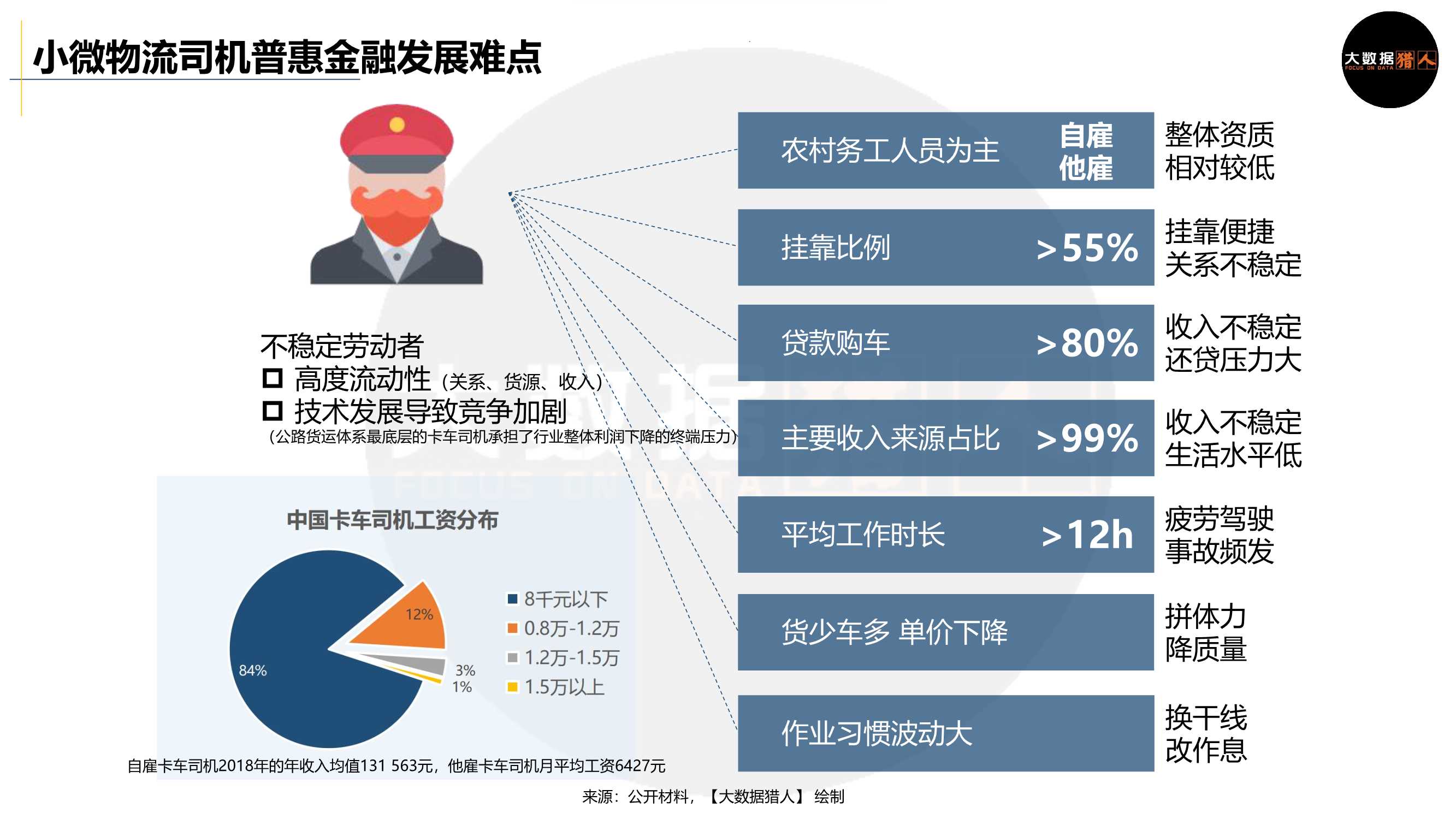 小微物流企业普惠金融这么难做,那是否小微物流的货运司机群体会好点呢?怎么说也算是个人金融,互联网的个人金融产品成熟、风控能力成熟,有些网络货运平台也有大部分司机运营收入的数据,这样乍一看,应该是个蓝海。