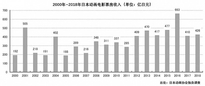 2018年,日本上映了74部动画电影。其票房收入达426亿日元(27.2亿元人民币),同比增长约4%。由于增长并不明显,可以说基本只是与上一年持平。