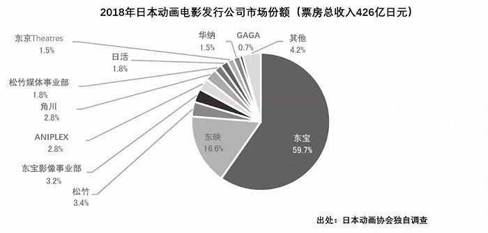 18年在日本上映的电影有1192部,总票房为2225.1亿日元,其中日本本土电影占613部,票房为1120.2亿日元。与此相对,日本本土动画电影占74部,票房为426亿日元。即以少量作品取得高占比。