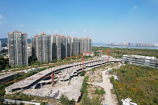 已成为烂尾楼的恒大杭州商业中心,以往明显的恒大标识也不见踪影。图自视觉中国
