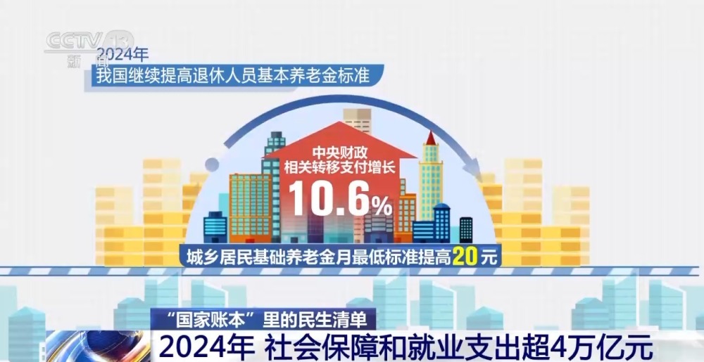 不仅是就业,在社会保障方面,今年,我国继续提高退休人员基本养老金标准,城乡居民基础养老金月最低标准提高20元,中央财政相关转移支付增长10.6%。