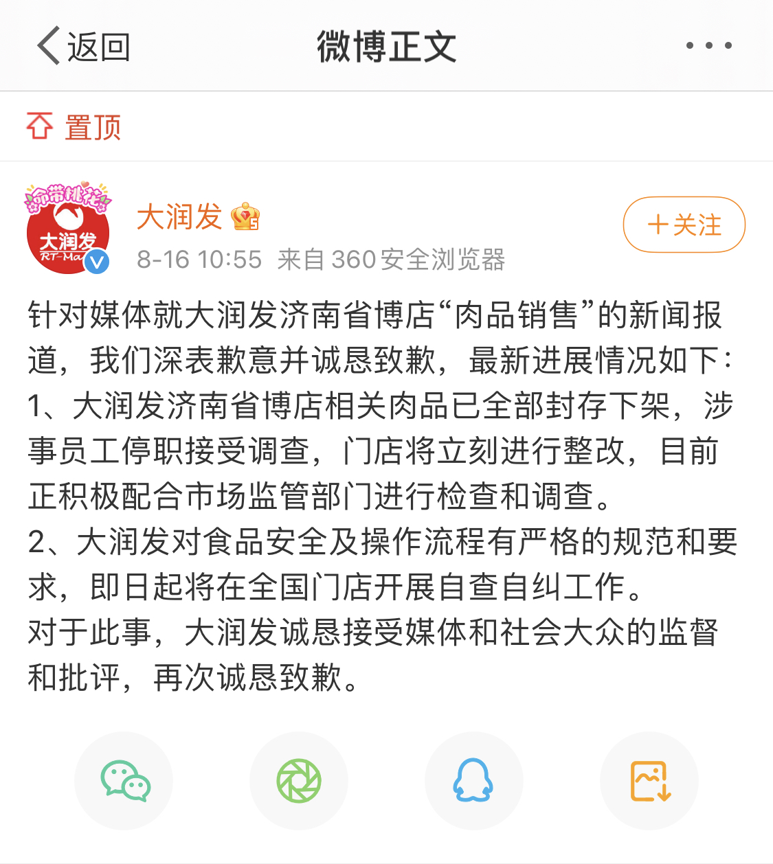 大润发官方微博今日针对媒体就大润发济南省博店“肉品销售”的新闻报道,深表歉意并诚恳致歉,最新进展情况如下: