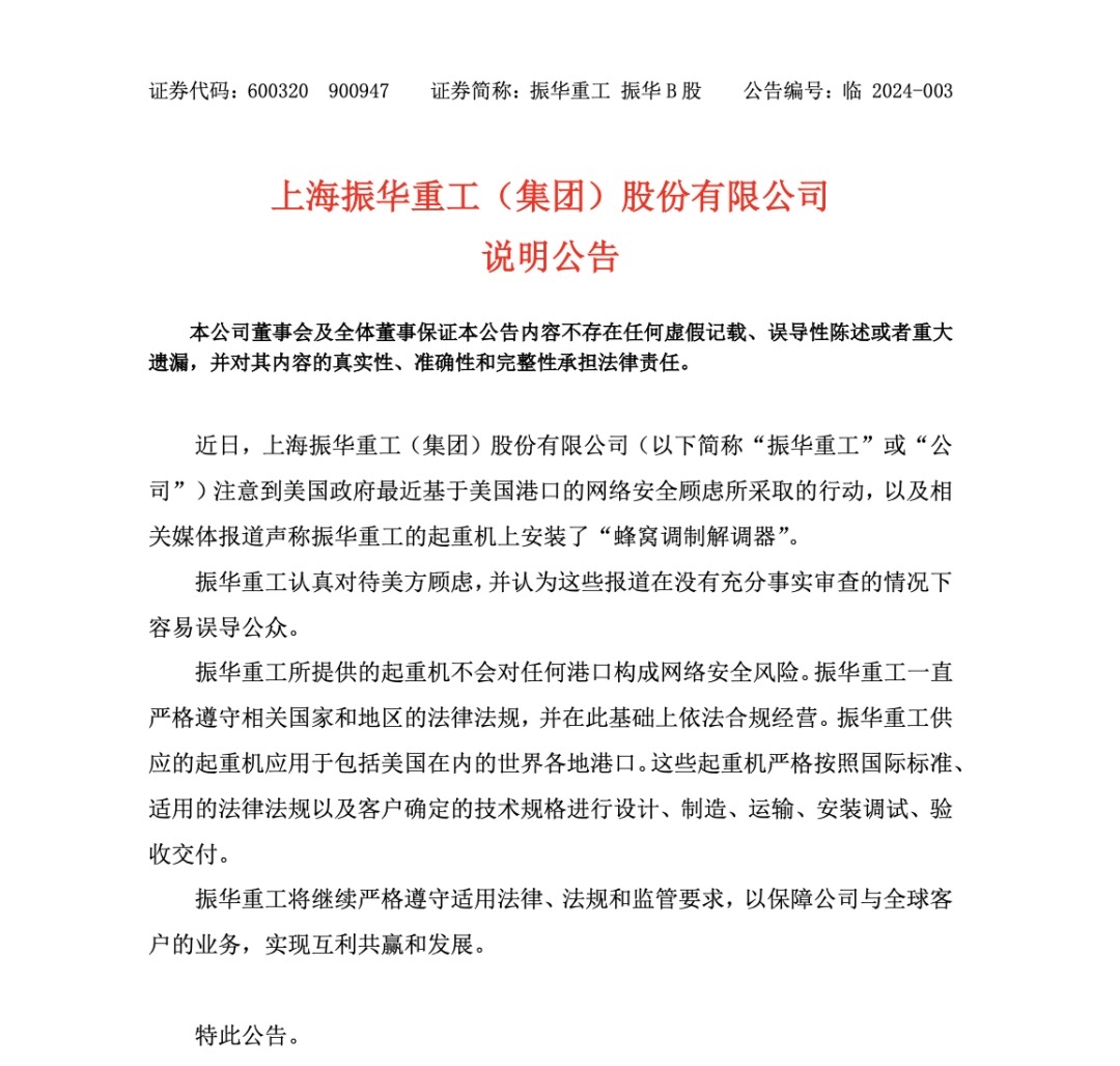 3月10日晚,振华重工公告称,近日公司注意到美国政府最近基于美国港口的网络安全顾虑所采取的行动,以及相关媒体报道声称振华重工的起重机上安装了“蜂窝调制解调器”。振华重工认真对待美方顾虑,并认为这些报道在没有充分事实审查的情况下容易误导公众。振华重工所提供的起重机不会对任何港口构成网络安全风险。