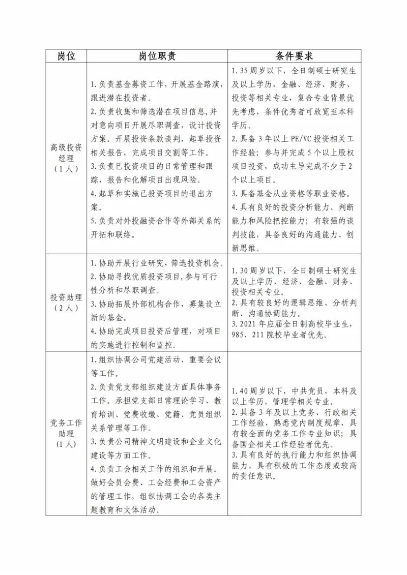 (一)招聘岗位、人数高级投资经理 1人投资助理 2人党务工作助理 1人(二)岗位职责及资格条件