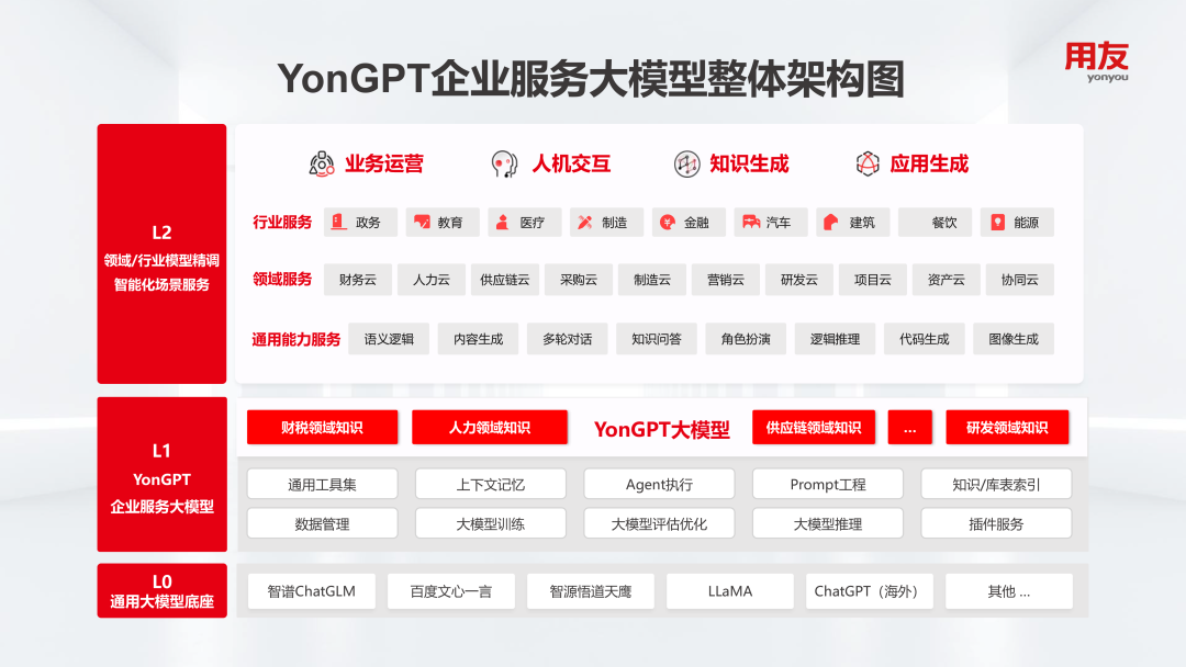 7月27日,用友在北京隆重发布了企业服务大模型YonGPT,这是用友基于数字和智能技术服务企业和公共组织数智化的最新研发成果。YonGPT覆盖企业财务、人力和业务,是多领域融合化、多形态综合型的企业服务大模型。