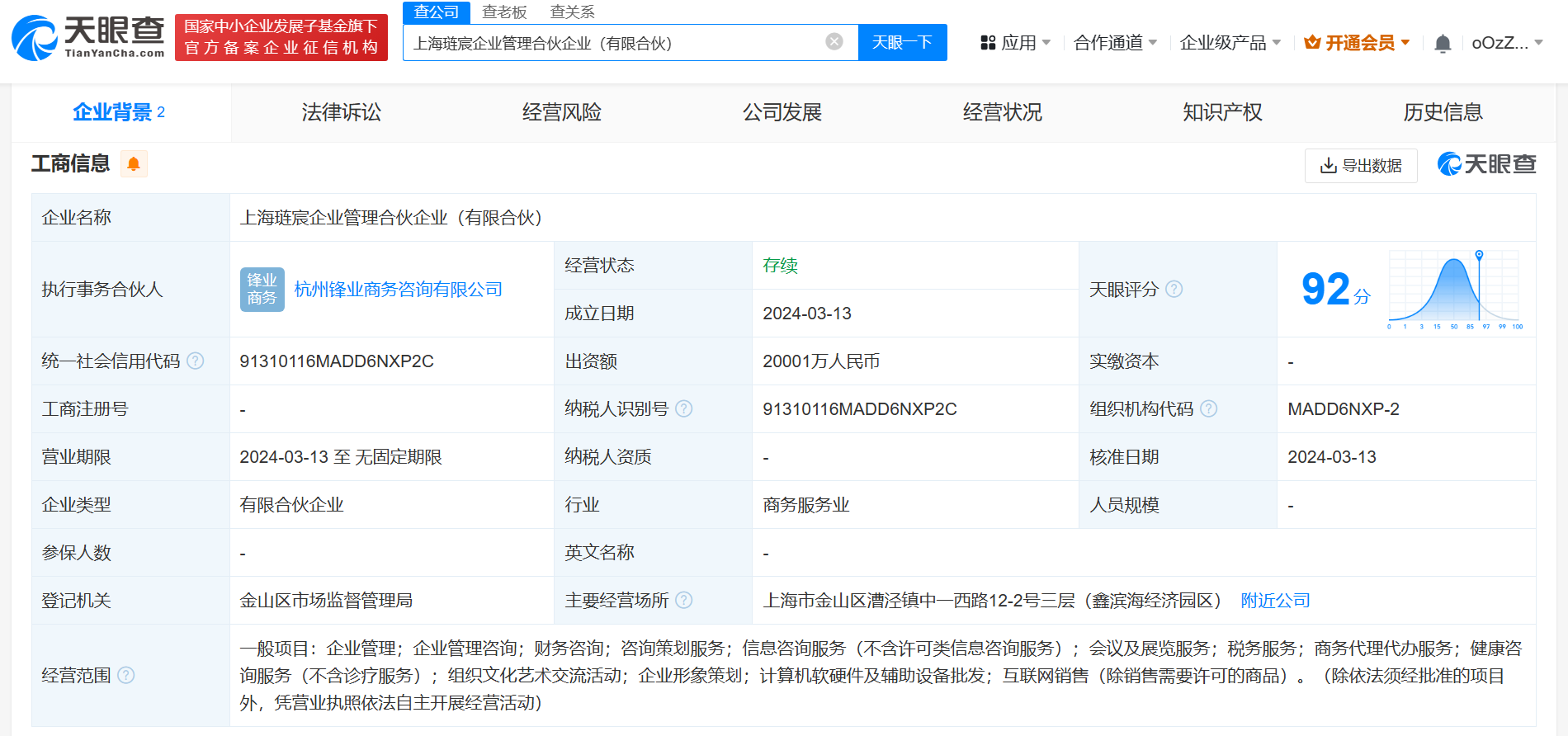 南方财经3月19日电,天眼查App显示,近日,上海琏宸企业管理合伙企业(有限合伙)成立,出资额约2亿人民币,执行事务合伙人为杭州锋业商务咨询有限公司,经营范围含企业管理、信息咨询服务、组织文化艺术交流活动、互联网销售等。合伙人信息显示,该企业由杭州锋业商务咨询有限公司与芯联集成(688469)旗下芯联股权投资(杭州)有限公司共同出资。
