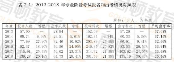 1.专业阶段六科平均出考率为35.46%,过去6年平均出考率都低于40%。