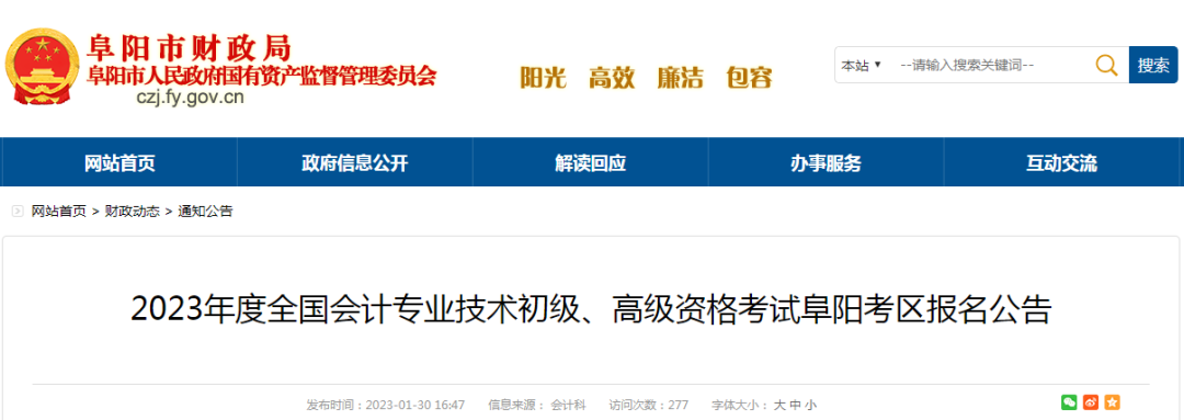 2023年度全国会计专业技术初级、高级资格考试阜阳考区报名公告