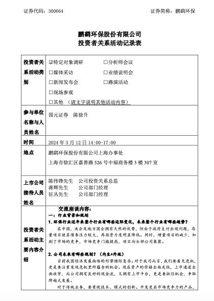 鹏鹞环保股份有限公司(以下简称“鹏鹞环保”或“公司”)3月12日晚间发布公告称,公司于当日接受了国元证券的特定对象调研。在调研中,鹏鹞环保透露,公司的利润率仍处于同行的中上水准,但毛利率下滑是行业大趋势。如果仍是做传统行业,维持现在的净利润水平较为困难,只有开辟新的赛道才有可能逐步改善提升的空间。公司目前自行研发的SEED未来水厂就属于新开辟赛道,但市场培育需要一定周期,如果市场认可度高,则有可能大幅提高工程项目毛利率。