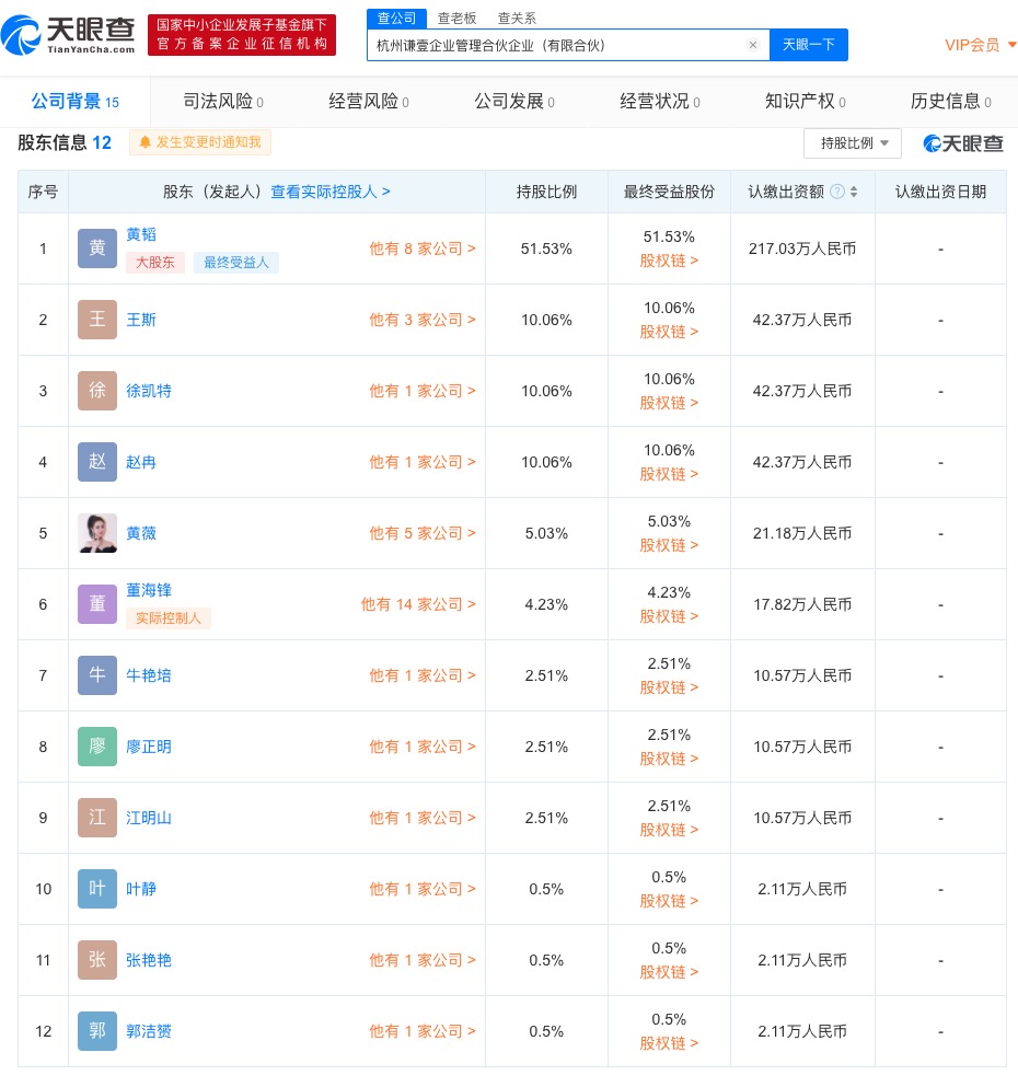 【环球网综合报道】天眼查App显示,近日,杭州谦壹企业管理合伙企业(有限合伙)成立。该公司执行事务合伙人为薇娅丈夫董海锋,经营范围包含企业管理咨询;企业管理(除依法须经批准的项目外,凭营业执照依法自主开展经营活动)。杭州谦壹企业管理合伙企业(有限合伙)工商披露的股东共有12位,其中黄薇(著名淘宝主播薇娅)为公司第五大股东,持股比例为5.03%,董海锋为公司第六大股东,持股比例为4.23%。