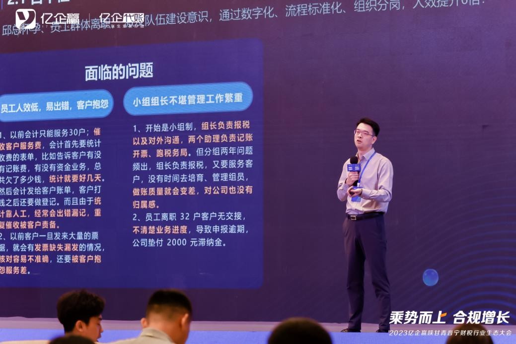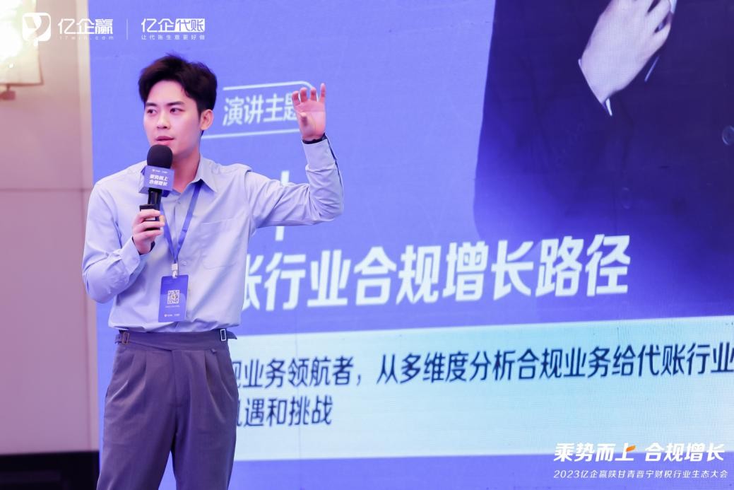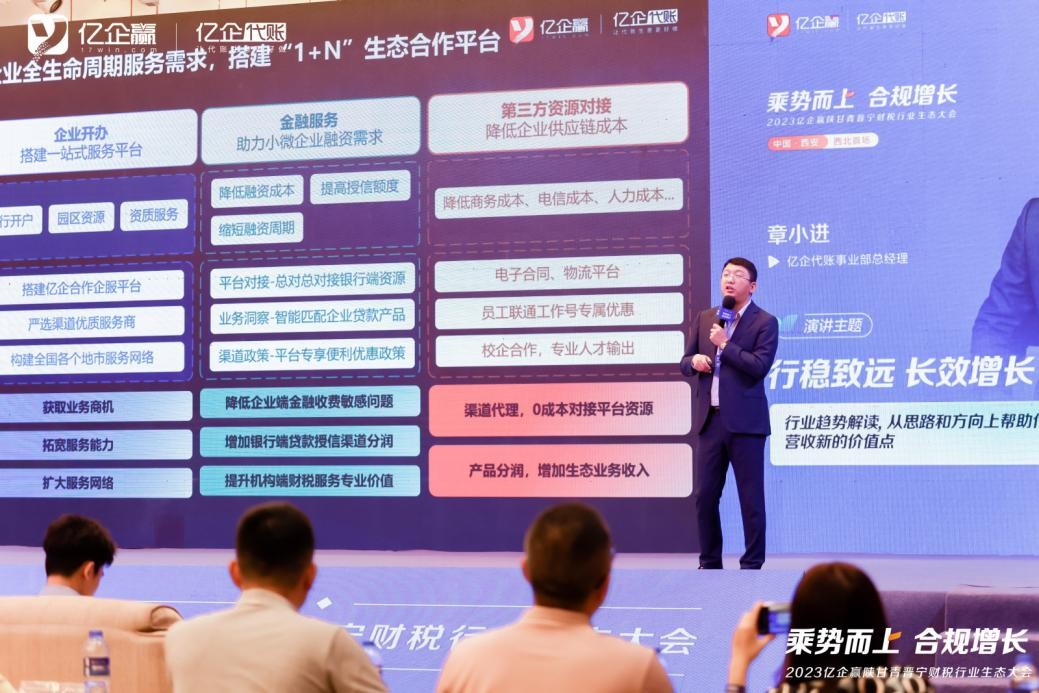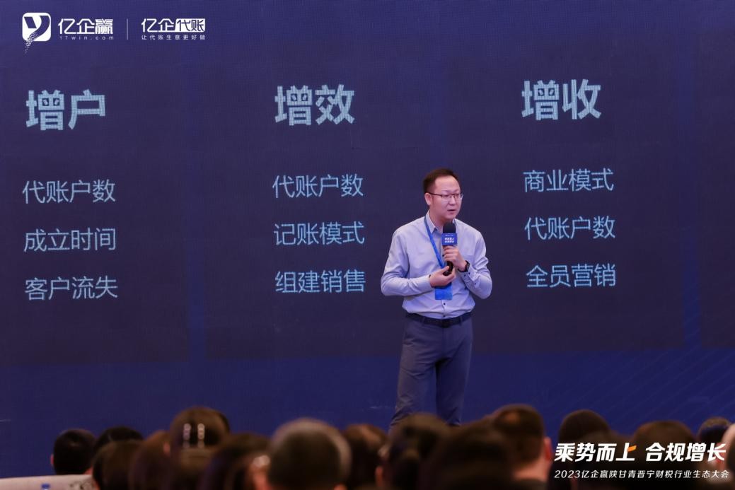 随后,他以亿企代账从“提效降本”到“业务升级”的策略升级作为分享结尾,亿企代账将通过数字化支撑、经营赋能、合规赋能、生态系统四大动力体系,助力机构长效增长,为行业发展和经营贡献亿企赢的力量。